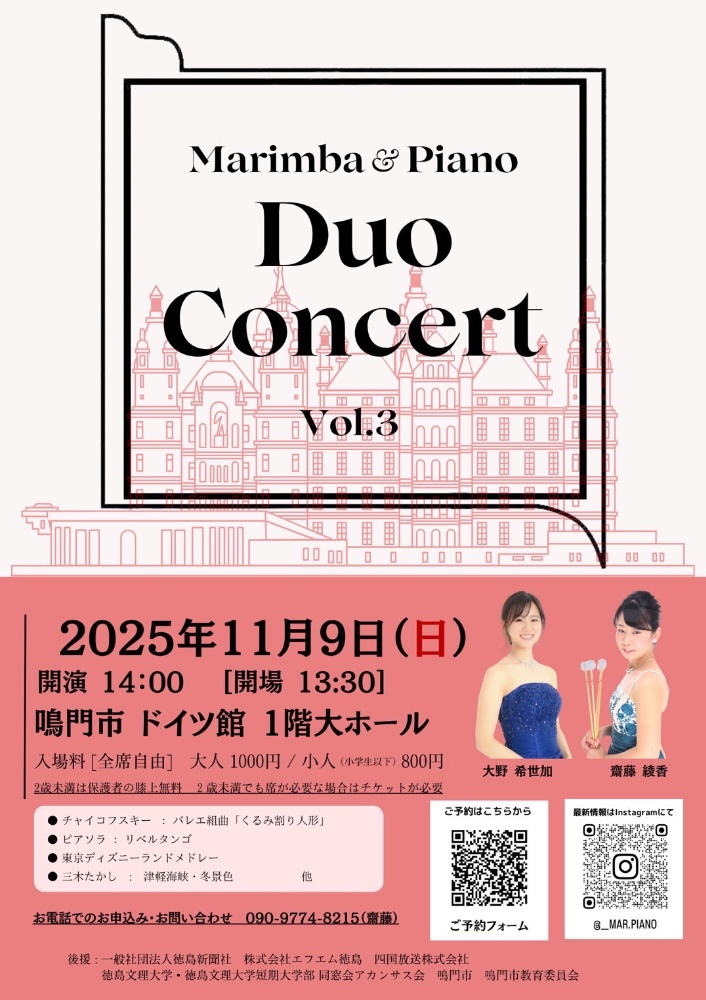 2025.11.09 (日) 14:00 開演 [ 13:30 開場 ]Marimba & Piano DUO concert鳴門市 ドイツ館 1階 大ホール